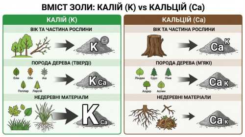 Зола, отримана від спалювання молодих дерев та гілок, зазвичай містить більше калію, а от попіл від старого дерева, навпаки, багатший на кальцій. Дрова м'яких порід дерев, як-от липа, ялина, сосна, вільха чи осика, залишать після себе попіл із меншим вмістом калію, ніж тверді породи, до яких належать в'яз, дуб, ясен, тополя та модрина. Варто зауважити, що зола від листя, трави та кореневищ бур'янів, особливо пирію, є надзвичайно багатою на калій.