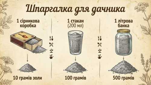 - 1 сірникова коробка вміщує 10 грамів золи;