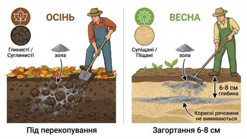Глинисті та суглинисті ґрунти краще здобрювати золою восени під перекопування, а легкі супіщані та піщані, навпаки, краще підживлювати навесні, загортаючи попіл на глибину приблизно 6 або 8 сантиметрів, щоб корисні речовини не вимивалися.