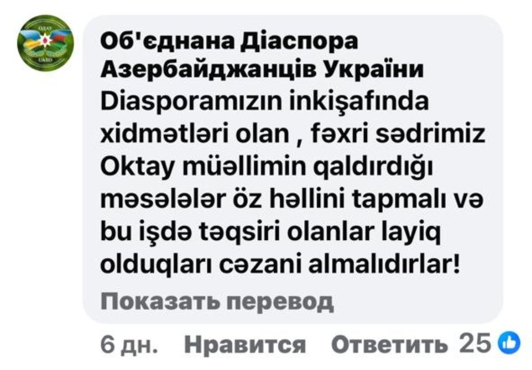 Зрештою, це питання не лише моралі, а й національної безпеки. Можливо, спецслужбам варто звернути увагу на заклики до міжнаціональної ворожнечі, які лунають від керівника ОДАУ? І чи дійсно азербайджанцям України потрібна така діаспора, яка замість того, щоб захищати свою громаду, навпаки атакує своїх же співвітчизників?