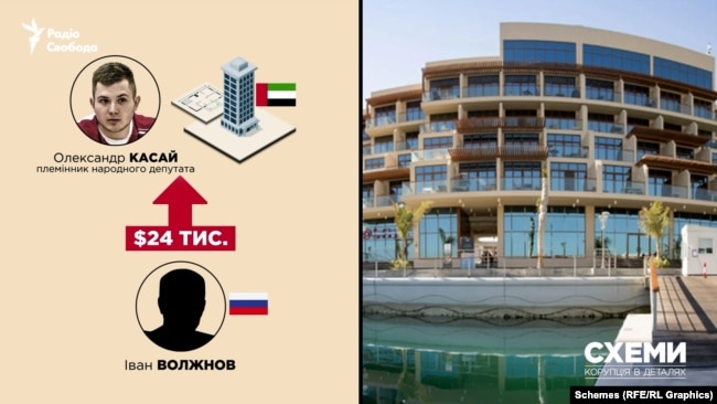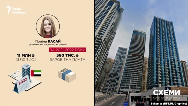 Поліна Касай, на той момент 22-річна донька нардепа «Слуги народу», купила двокімнатну квартиру у житловому комплексі Dubai Gate 2 за 310 тисяч доларів (близько 9 мільйонів гривень на час купівлі).