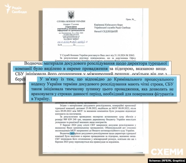 У відповідь на запит «Схем» в СБУ запевнили, що мова лише про провадження, яке стосується співвласників турецької фірми, а призупинили його для того, щоб не спливли терміни досудового розслідування, визначені законом. У відомстві зазначили, що це «дозволить не враховувати у строках давності період, необхідний для повернення фігурантів в Україну».