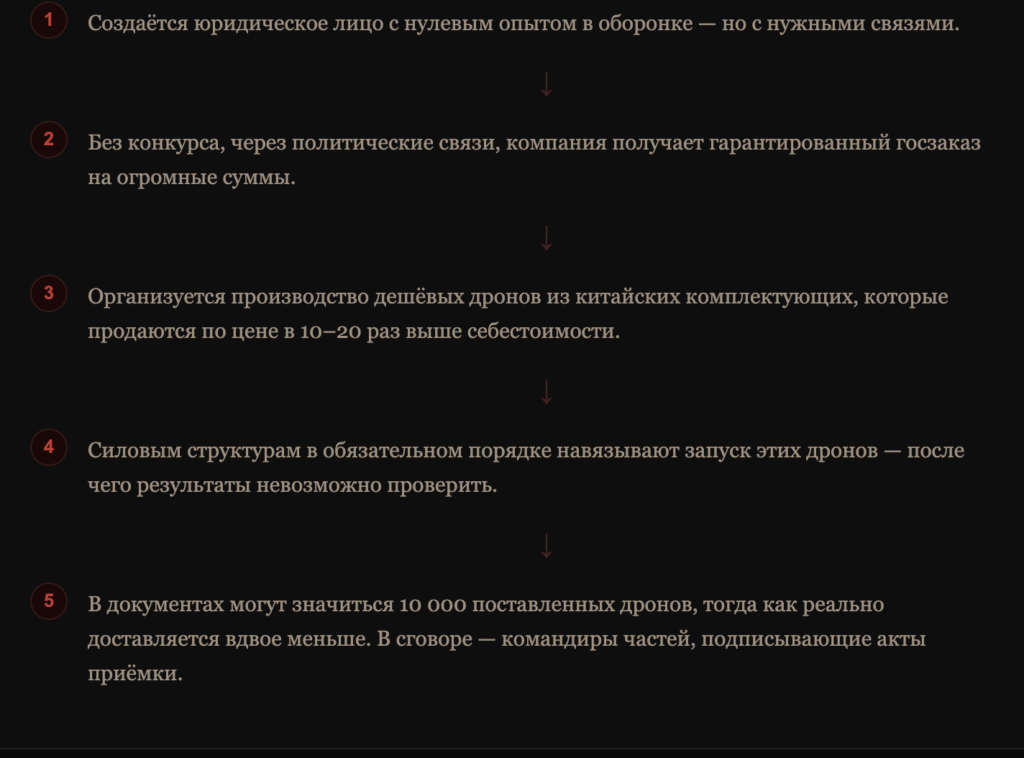 Третья и главная: тотальная коррупция при госзаказах. Через Министерство обороны за взятки продвигаются контракты с неизвестными производителями. Практикуется кратное завышение стоимости по сравнению с себестоимостью. Функционирует схема «мёртвых душ» — на бумаге отгружаются 10 000 дронов, реально доставляется 5 000. Подписи командиров воинских частей в актах приёмки — неотъемлемая часть схемы.