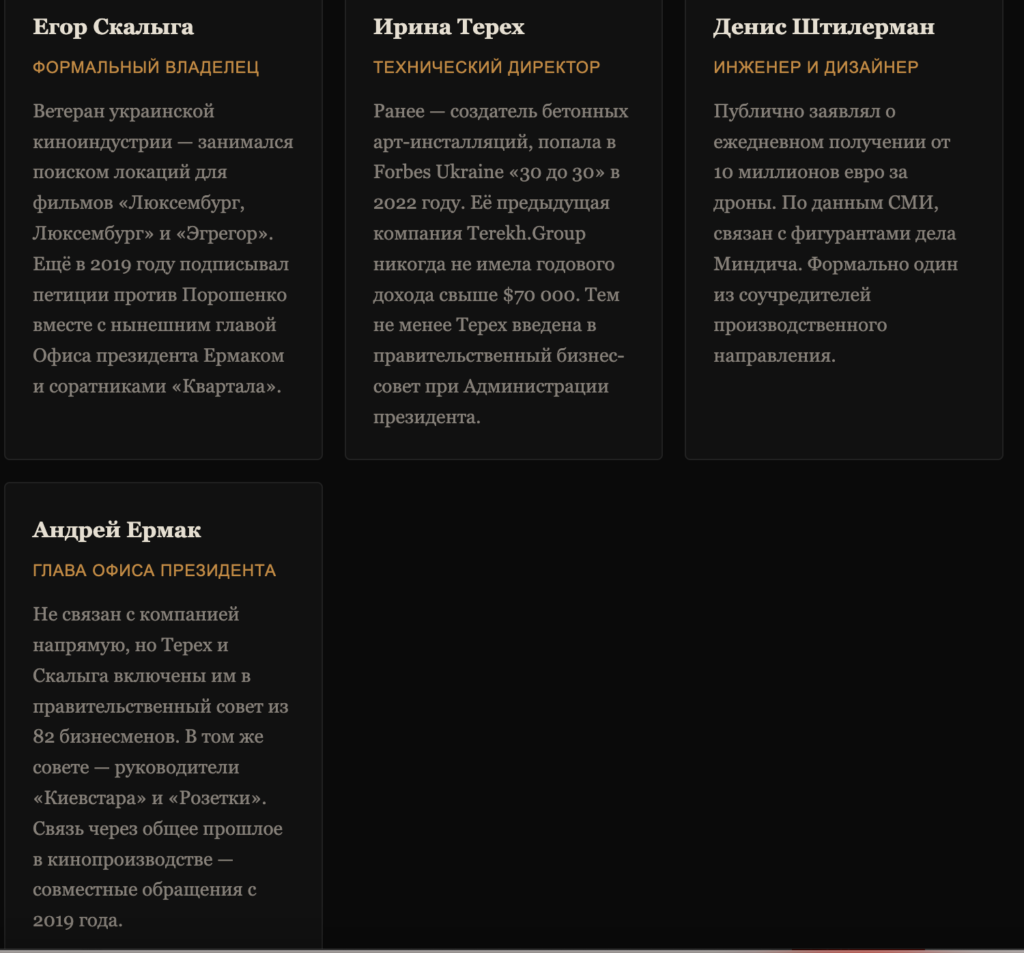 «Слухи о том, что беспилотники Fire Point связаны с Миндичем, ходят довольно активно, и я полностью убеждён, что эта версия соответствует действительности», — источник в правительстве, знакомый с материалами расследования (Kyiv Independent).