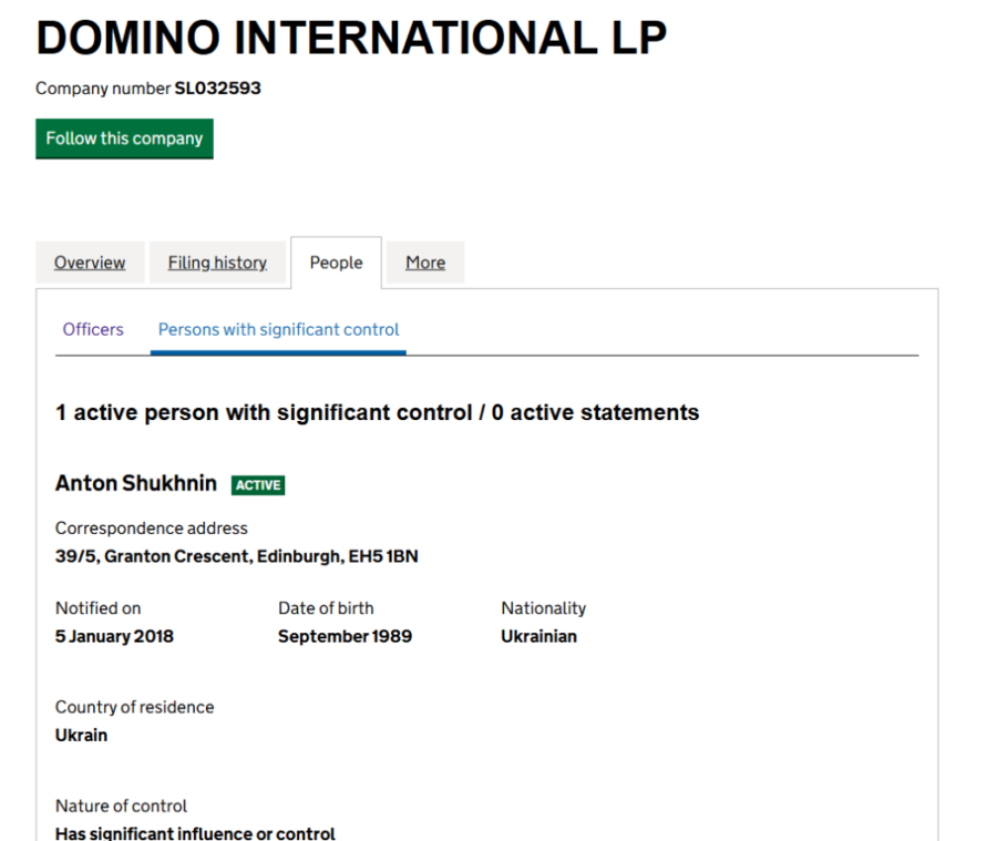 - Британия: Companies House — DOMINO INTERNATIONAL LP (SL032593); Persons with significant control: Anton Shukhnin. (Find and Update Company Information)