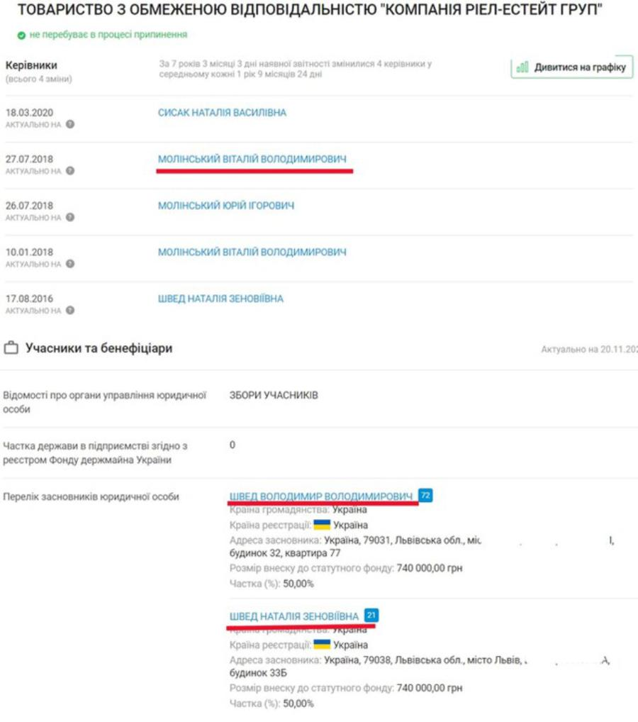 Конечно же, с такой репутацией даже дружба с мэром Львова не спасала Владимира Шведа. Итак, была придумана классическая схема с привлечением мальчика-зайчика, в качестве нового медийного лица. Торговые центры строит Швед, но чтобы лишний раз не напоминать о себе, рекламировать их и представлять он делегировал бармену Петру Пуняку. Кстати, помните, сначала этого материала упоминалось, что Петр Пуняк в 2019 году числился руководителем компании «Мой центр пищи»? Сейчас этот пост занимает Молинский Виталий Владимирович, который «по стечению обстоятельств» в 2018 году был руководителем «Риэл-Эстейт Груп» бизнесмена Владимира Шведа».