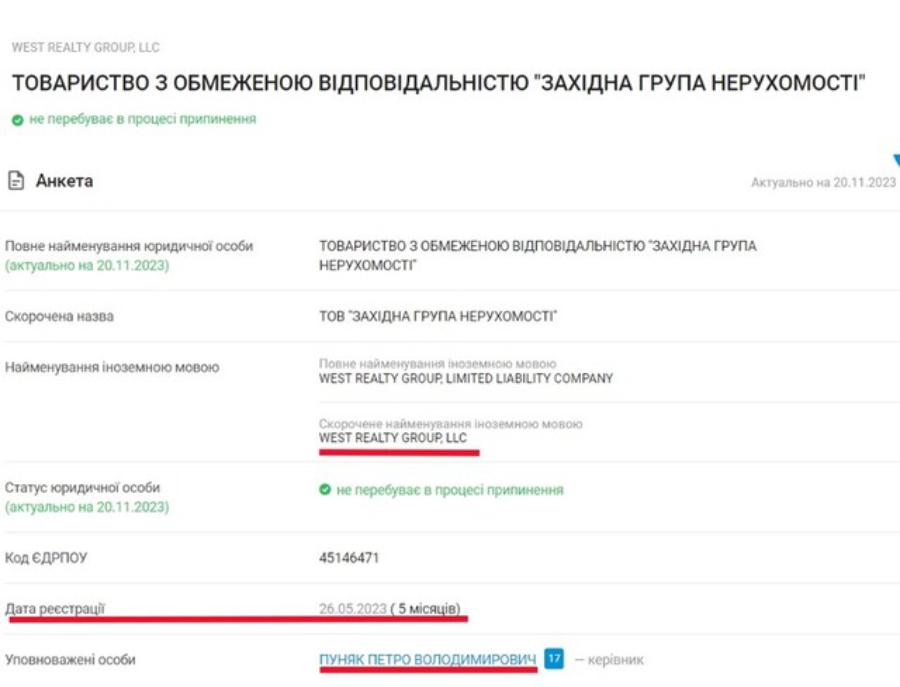 Выяснилось, что к этому году это действительно было именно так. Только в мае 2023-го было зарегистрировано ООО «Западная группа недвижимости», которое имеет англоязычное название WEST REALTY GROUP, LLC (WR Group). Руководителем и учредителем этой компании является Петр Пуняк, а размер уставного капитала составляет целых 20 000 грн. То есть — одна из крупнейших компаний по управлению коммерческой недвижимости в западном регионе — это всего лишь ФЛП, дополненный ООО с капиталом в одну среднюю зарплату по Украине.