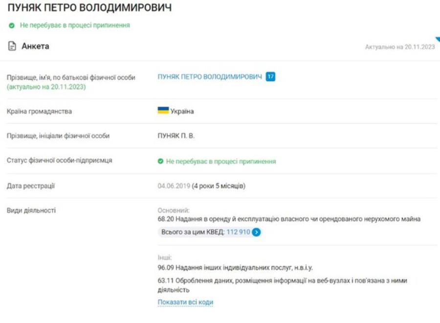 На самом деле Пуняк Петр Владимирович в 2019 году владел исключительно ФЛПом, который специализировался на предоставлении в аренду и эксплуатацию собственного или арендованного недвижимого имущества.