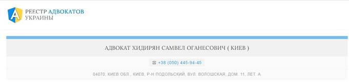 Правда, в среде киевских адвокатов о нем практически не знают – судя по всему, удостоверением адвоката Хидирян пользуется исключительно редко и адвокатских услуг, кроме как себя самого, никому не предоставляет. Впрочем, законом это не возбраняется. Кстати, адвокатом является и его родственник Самвел, с которым Мисак проживает, согласно данных российского реестра, в Москве, на улице Братиславской, 25, кв. 15. И одновременно ведет адвокатскую деятельность в Киеве, на улице Волошской, 11, литера «А»: