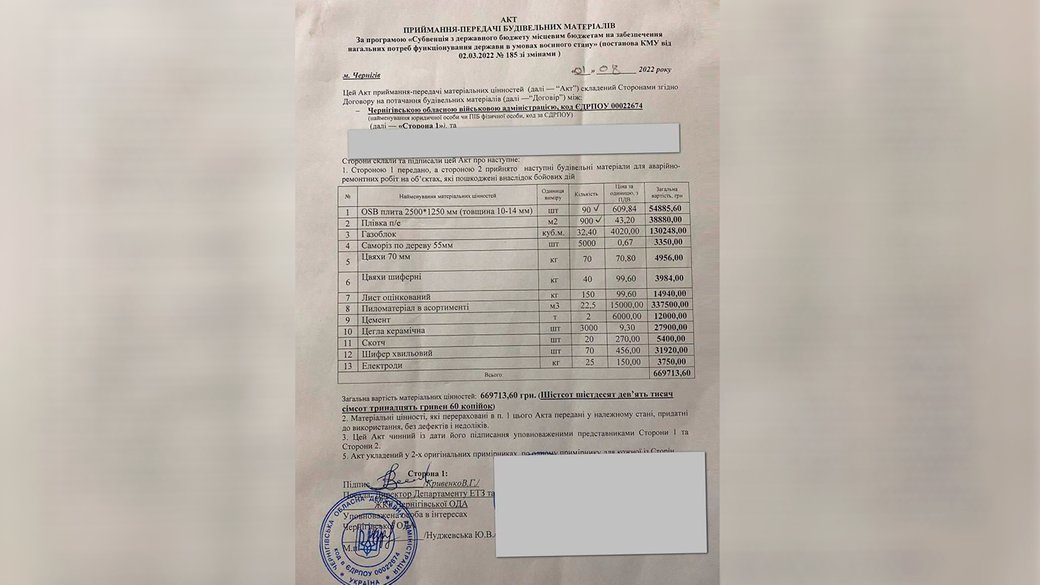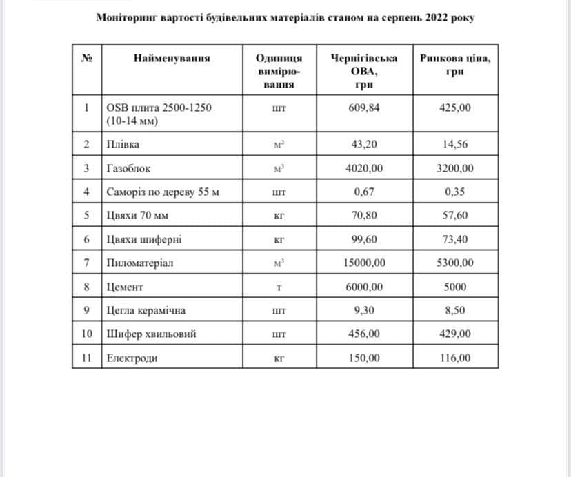 Серик показав документи, які свідчать про те, що ОВА завищує ціни на закупівлі будівельних матеріалів у три-п’ять разів. Йдеться конкретно про закупівлю матеріалів на відбудову зруйнованого російськими військами житла жителів регіону у 2022 році.
