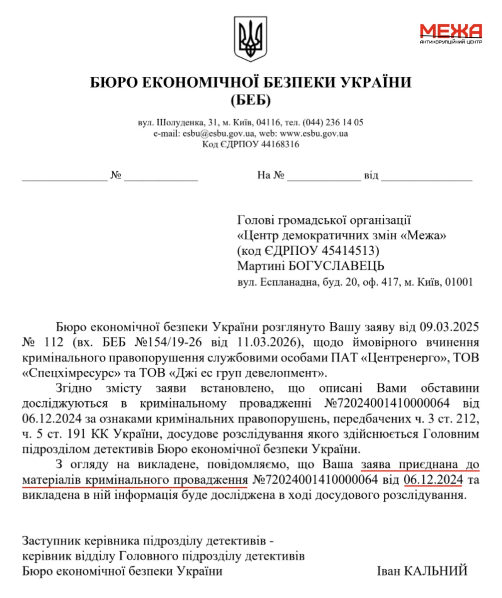 БЕБ долучило матеріали розслідування про дерибан на відбудові ТЕС до вже відкритої кримінальної справи. Це ще раз підтверджує існування схеми, яка була в полі зору правоохоронних органів із 2024 року.