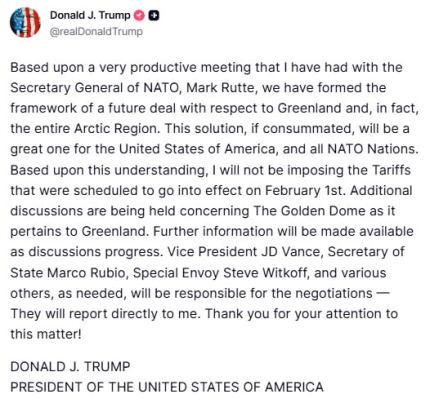 - Президент США не планує вводити мита проти європейських країн завдяки угоді щодо Гренландії.