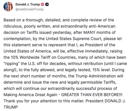 Прошу вважати цю заяву підтвердженням того, що я, як президент Сполучених Штатів Америки, негайно підвищую 10-відсоткове глобальне мито для всіх країн — багато з яких десятиліттями "обдирали" США без жодної відповіді (допоки не з’явився я!) — до максимально дозволеного та юридично перевіреного рівня у 15%.