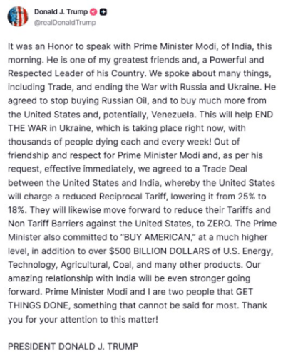 Для мене було честю поговорити сьогодні вранці з прем'єр-міністром Індії Моді. Він один з моїх найкращих друзів і впливовий та шанований лідер своєї країни. Ми обговорили багато питань, зокрема торгівлю і припинення війни між Росією та Україною. Він погодився припинити закупівлі російської нафти і купувати набагато більше нафти у США і, можливо, у Венесуели. Це допоможе припинити війну в Україні, яка відбувається прямо зараз і в якій щотижня гинуть тисячі людей.