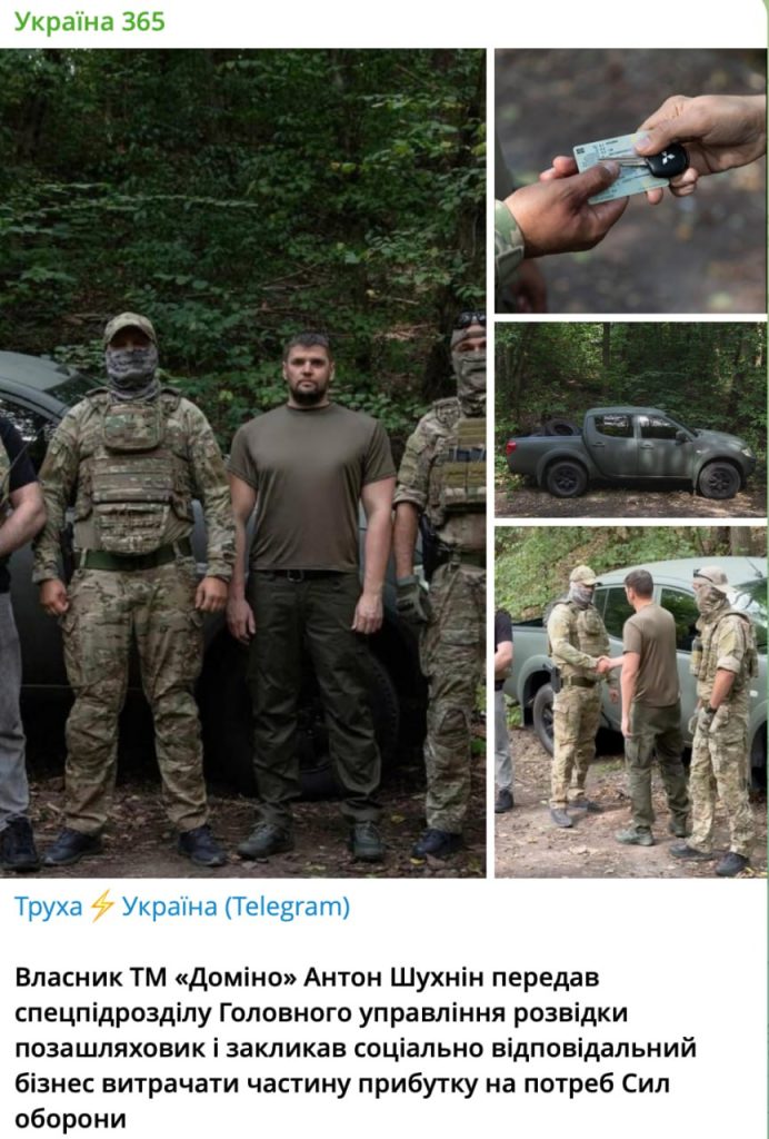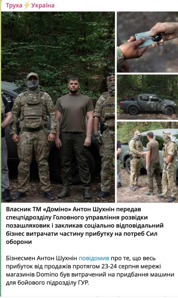 Шухнін активно створює образ патріота. У серпні 2025 року він передав ГУР Міноборони вживану автівку Mitsubishi L200 вартістю $5–10 тис., але витратив щонайменше $40 тис. на просування цього вчинку в медіа та популярних Telegram-каналах.