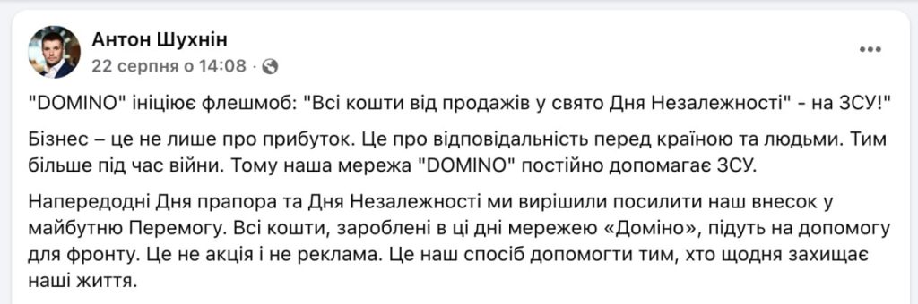 Він закликав бізнесменів перерахувати ЗСУ прибутки за 23–24 серпня (День Прапора та День Незалежності), що активно висвітлювало видання «Українські новини».