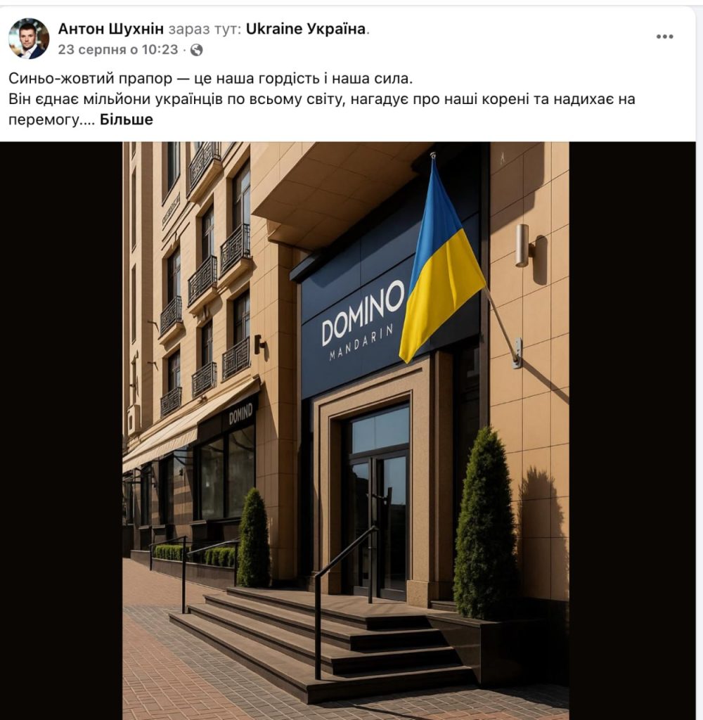 23 серпня Шухнін опублікував у Facebook допис про «синьо-жовтий прапор — нашу гордість і силу» з фото магазину Domino в центрі Києва, біля якого нібито майорить великий прапор України. Але зображення згенероване штучним інтелектом — реального прапора біля бутіка немає.