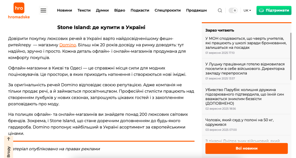 28 серпня 2025 року видання «Громадське» опублікувало матеріал про те, як відрізнити оригінальні вироби Stone Island від підробок. Після порад щодо деталей автентичності журналісти рекомендували купувати бренд у Domino, підкресливши: «За оригінальність відповідає репутація компанії. Domino не лише продає, а й просвітлює: стилісти створюють лукбуки, запрошують гостей і захоплено розповідають про моду».