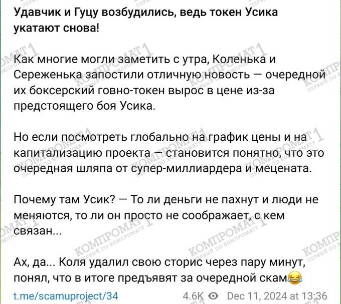 Последним «хитом» от Сергея Гуцу стал «Токен Усика» – Ready to Fight ($RTF). Что там делал Усик – непонятно. Видимо, тоже повелся на красивые истории от Сергея Гуцу и его давнего партнера и знакомца Николая Удянского. Именно они стояли за «первым в мире боксерским токеном». Но с «токеном Усика» случилось ровно то, что и с предыдущими «токенами» Удянского и Гуцу – он рухнул в пропасть сразу после боя.