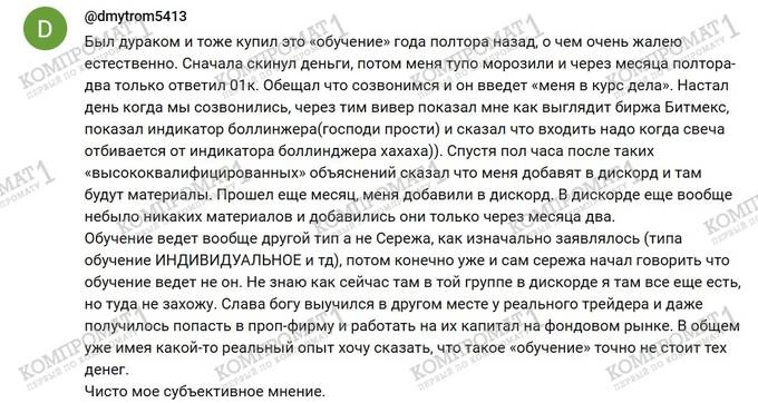 После того, как это интервью с «криптовалютным гуру» 00000000000001КСережей увидел миллион зрителей, продавать «обучающие курсы» было уже просто. Первый стоил 600 долларов и не нес в себе ничего, кроме надерганного по интернету набора банальностей, но попробуйте себя заставить и посмотреть хотя бы минут двадцать этого интервью (вот ссылка) – вы поймете, что люди, проглотившие этот откровенный бред сумасшедшего и принявшие всю ту невообразимую чушь, которую вещал Сергей Гуцу, за чистую монету, купят что угодно. Лишь бы это продавал кто-то типа «гуру00000000000001К».