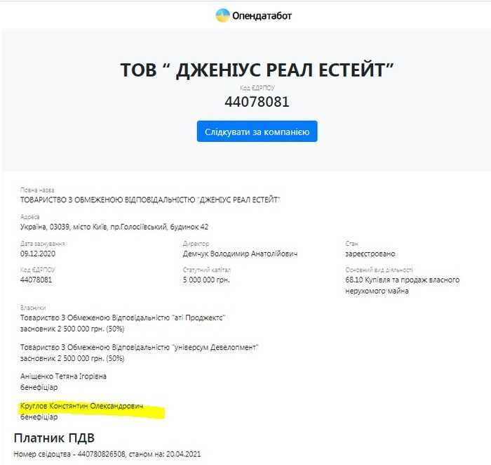 Ресурс показывает товарища по кличке «Круглый» исключительно по одной компании, а именно: владельцем и бенефициаром ООО “ДЖЕНИУС РЕАЛ ЭСТЕЙТ”.