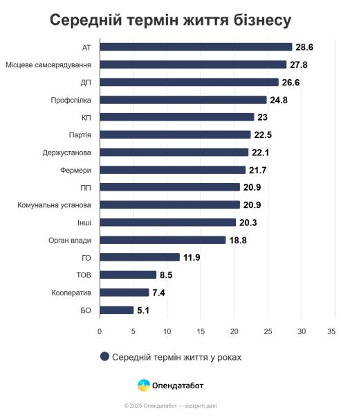 А ось найменший строк життя виявився у благодійних організацій: 5 років, обслуговуючих кооперативів — 7 років 5 місяців та ТОВ — 8,5 років.