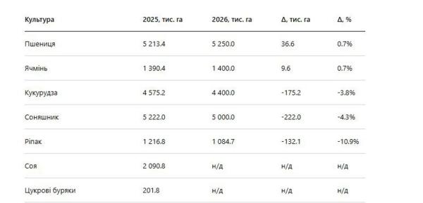 На цьому фоні кукурудза скорочується до 4 400,0 тис. га з 4 575,2 тис. га у 2025 році (мінус 175,2 тис. га, -3,8%).