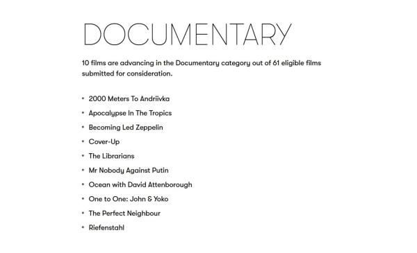 10 фільмів проходять далі в категорії “Документальний фільм” з 61 фільму, поданого на розгляд