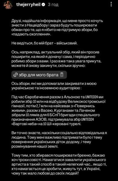 Співачка Jerry Heil повідомила про поширення неправдивої інформації щодо її байдужості до зборів для ЗСУ. Вона наголосила, що її брат служить у війську, і вона регулярно підтримує його збори, а також брала участь у багатьох благодійних ініціативах.