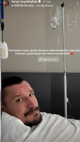 Український актор Тарас Цимбалюк з’явився на лікарняному ліжку з крапельницею. Він пояснив, що це вітамінна терапія для зміцнення організму.