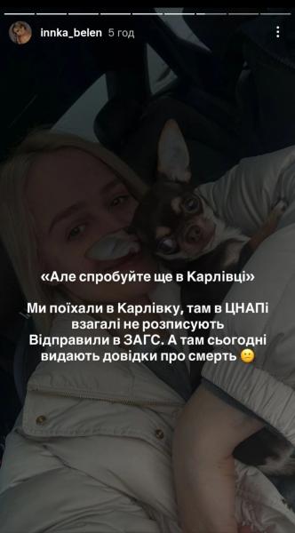 Переможниця романтичного реаліті “Холостяк-13”, волонтерка та блогерка Інна Бєлєнь повідомила, що їй та її нареченому Івану відмовили в реєстрації шлюбу в органах РАЦС. Про це повідомляє УНН з посиланням на Instagram-stories медійниці.