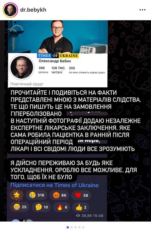 Слідчі встановили, що під час проведення пластичних операцій – а саме ринопластики (пластика носу) та броуліфтингу (пластична операція для підняття лінії брів) – Бебих понівечив обличчя пацієнтки. У Київській міській прокуратурі уточнили, що вказані операції він провів ще у квітні 2023 . Постраждала заплатила за них 7,2 тис. євро.