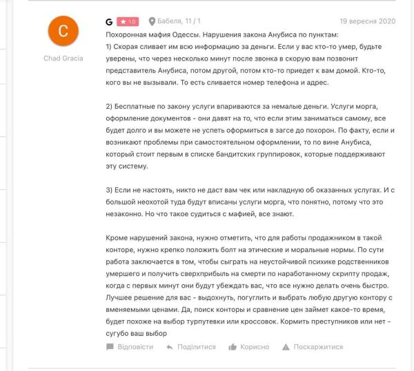У відгуках про роботу “Анубіса” в Одесі клієнти розповідають про те, що о четвертій ранку до них приходив агент похоронного дому і в стресовій ситуації навʼязував свої послуги. Вони не виключають, що інформацію про померлих похоронному дому “зливають в поліції чи швидкій допомозі”.
