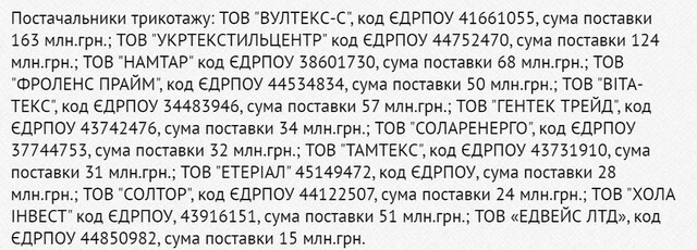 Але річ у тому, що цей текстиль не використовується у виробництві форми, яку ТОВ «МІК» шиє на замовлення Міністерства оборони. Проте лише сума ПДВ у закупівлях ТОВ «МІК» від фірм, наведених на фото вище, становить 145 мільйонів гривень.