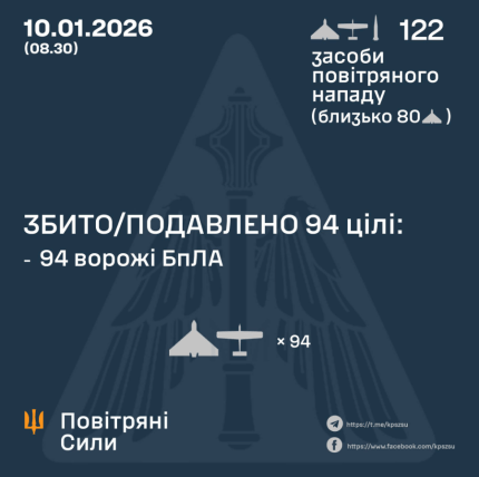 За попередніми даними, станом на 08:30, протиповітряною обороною збито/подавлено 94 ворожі БпЛА типу Shahed, Гербера і дрони інших типів на півночі, півдні та сході країни.