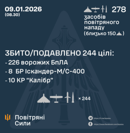 Протягом ночі 8-9 січня Росія завдавала комбінованого удару по об’єктах критичної інфраструктури України із застосуванням ударних БпЛА, ракет морського та наземного базування. Загалом ворог використав 278 засобів повітряного нападу — 36 ракет та 242 БпЛА різних типів.