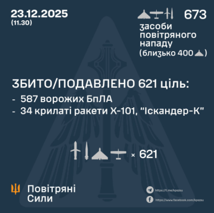• ППО змогла збити/подавити 621 ворожу повітряну ціль.