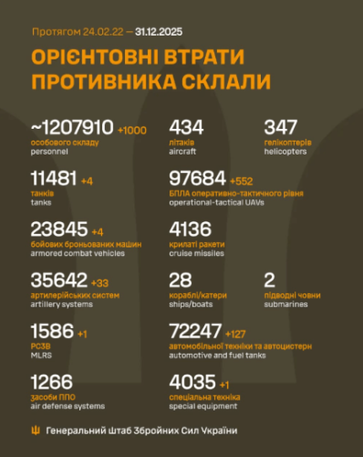 Втрати армії РФ станом на 31 грудня 2025 року