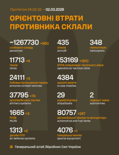 - Загальні бойові втрати російських військ від 24 лютого 2022 року до 2 березня 2026 року складають близько 1 267 730 осіб, у тому числі 960 осіб за останню добу.