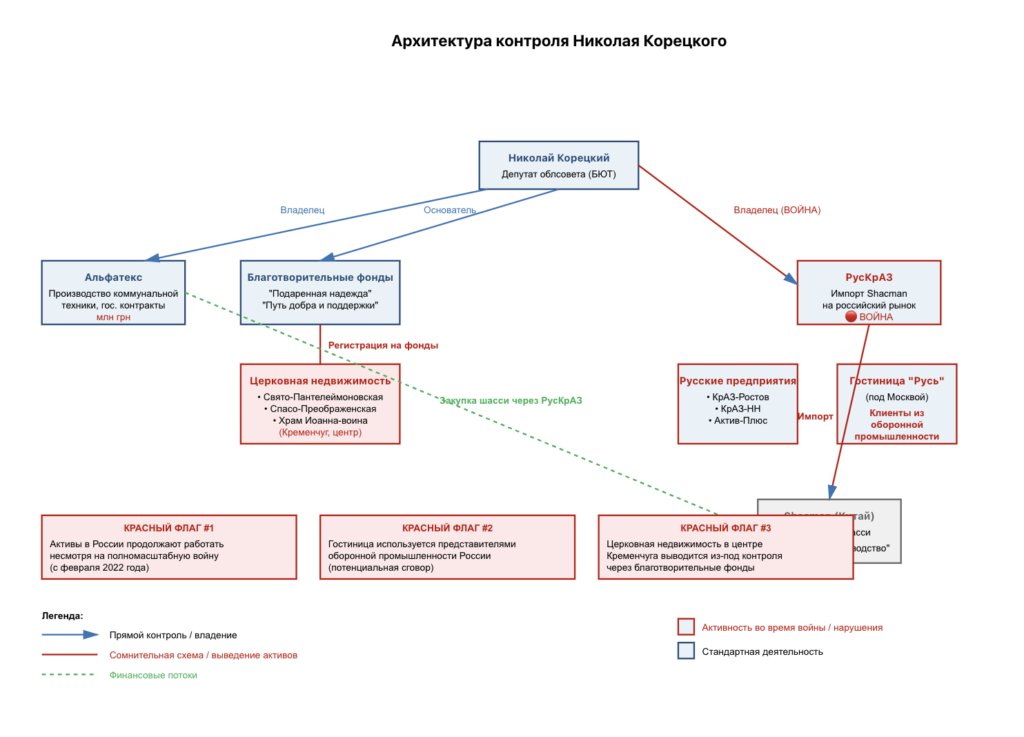 Расследование выявило сложную схему, в центре которой находится Николай Корецкий — депутат Полтавского областного совета, предприниматель и основатель фондов, которые де-факто контролируют церковную недвижимость. Одновременно с сохранением украинских активов и контролем над церковным имуществом, Корецкий поддерживает бизнес-структуры в России, включая предприятия, связанные с оборонной промышленностью.