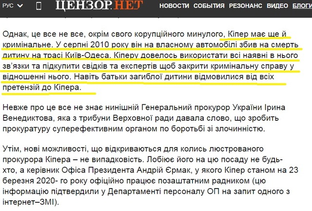 Среди наиболее громких скандалов, связанных с именем руководителя Киевской городской прокуратуры Олега Кипера, нельзя не упомянуть пусть и давнее, но тем не менее весьма важное дело. Еще в апреле 2020 года журналист Андрей Коваленко сообщил о том, что Олег Кипер в 2010 году на своем автомобиле сбил насмерть ребенка на трассе «Киев-Одесса»: