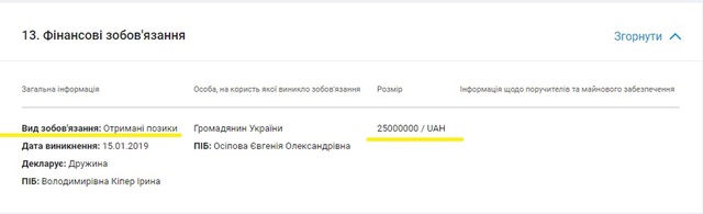 Вы не ошиблись в количестве нулей – гражданке Российской Федерации, супруге руководителя прокуратуры города Киева, Кипер Ирине Владимировне некая гражданка Украины Осипова Евгения Александровна одолжила 25 000 000 (Двадцать пять миллионов гривен). Под честное слово – ибо в графе «Інформація щодо поручителів та майнового забезпечення» стоит девственная пустота.