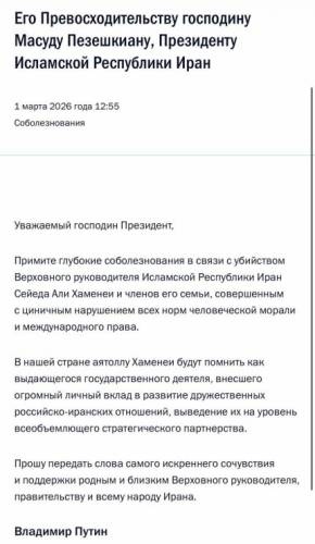 Прошу передати слова найщирішого співчуття й підтримки рідним і близьким Верховного керівника, уряду та всьому народові Ірану, — додав російський диктатор.