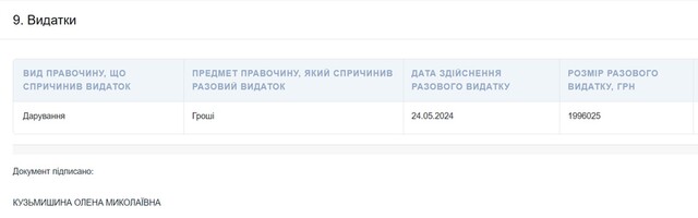 В 2024 году Елена Кузьмишина подала декларацию о существенном изменении материального состояния, из которой следует, что она кому-то подарила 1 996 025 гривен.
