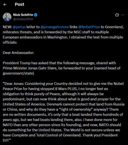 З огляду на те що ваша країна (Норвегія — ред.) вирішила не присуджувати мені Нобелівську премію миру за те, що я зупинив 8 воєн і більше, я більше не відчуваю обов'язку думати виключно про мир… хоча він завжди залишатиметься пріоритетом, але тепер я можу думати про те, що є хорошим і правильним для Сполучених Штатів Америки.