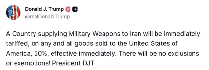 Країна, яка постачає військову зброю Ірану, буде негайно обкладена митами у розмірі 50% на всі товари, що продаються Сполученим Штатам Америки.
