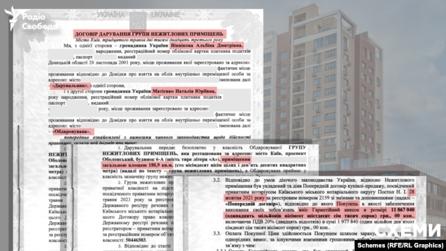 Теща Кириленка Наталія Матієнко оформила тут у березні 2023 року право власності на дві квартири. Обидві – на одному поверсі. Кожна з них має площу у майже 90 квадратів. Їхня сукупна вартість, за даними договорів, які є в розпорядженні «Схем», 9,5 мільйонів гривень. Ці кошти були внесені за попередніми договорами, укладеними у 2021 році.