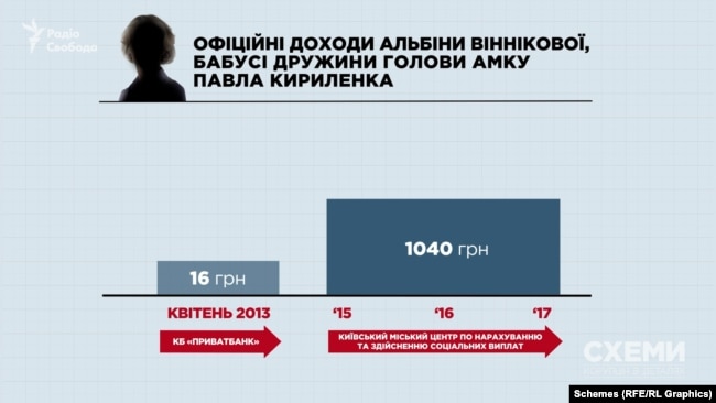 Саме 77-річна бабуся дружини Кириленка володіє квартирою у 200 квадратів у Києві – де по факту проживає родина посадовця. І саме вона подарувала своїй доньці – тобто тещі Кириленка – офісне приміщення у столичному ЖК, в якому тепер танцювальна студія.