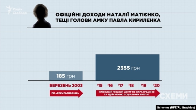 Теща Наталія Матієнко ніколи не мала бізнесу. Як вдалося з’ясувати «Схемам» за допомогою джерел із доступом до бази даних про офіційні доходи, з яких сплачувались податки, єдина виплата, яку вона отримала, була у 2003 році – 185 грн від приватного підприємства.