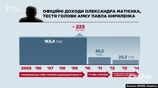Її чоловік, тобто тесть Кириленка, Олександр Матієнко переважно працював у ДАІ – державній автоінспекції, до її реформування у патрульну поліцію. У період з 2005-го по 2015 рік він отримав 223 тисяч гривень зарплати. Він також, як встановили журналісти, офіційно ніколи не був підприємцем. І вже 9 років, як ніде не працює.